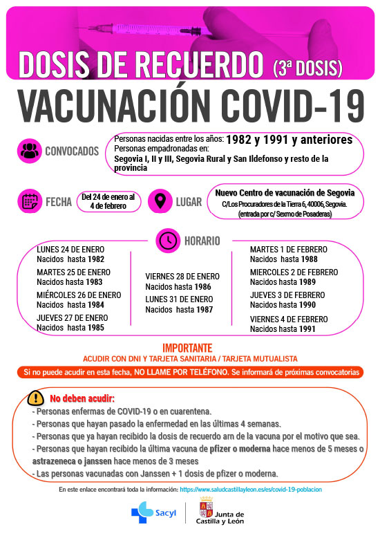 Durante la misma semana se administrará también la dosis de recuerdo a los residentes en la provincia incluidos en el mismo grupo de edad, aunque también pueden acudir al punto de vacunación de la capital. El martes, 25 de enero, empieza a vacunarse con tercera dosis en los centros de salud de Nava de la Asunción, Navafría (La Sierra) y Sepúlveda, a los mayores de 30 años residentes en estas zonas básicas de salud. El miércoles, 26 de enero, se inicia la vacunación en Carbonero el Mayor y Cuéllar, a los usuarios de estas zonas básicas. El jueves, 27 de enero, comienza a administrarse la tercera dosis a este grupo de edad en los centros de salud de Cantalejo y Riaza. El viernes, 28 de enero, en los centros de salud de Fuentesaúco de Fuentidueña, El Espinar y Villacastín, y el jueves, 3 de febrero, en el centro de salud de Sacramenia.