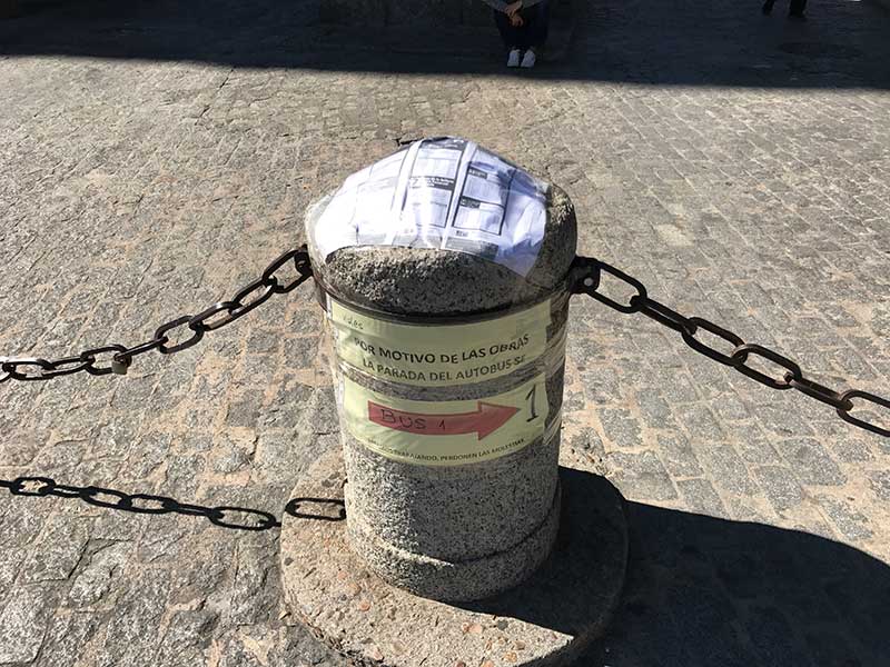 Los bolardos de granito, soportes provisionales de información del servicio de autobuses.