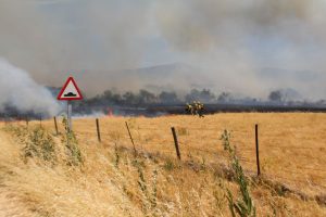 Algunos pastos, más verdes, aguantaban, pero los ya resecos ardían como yesca y las virutas de fuego, aireadas por el viento, propiciaban la aparición de nuevos focos a 10 o 20 metros generando un cordón de fuego alrededor de Sonsoto. La cara es que es zona de pastos, con escasa vegetación fuera de la paja, que se consume rápidamente; la cruz, que controlada una lengua de fuego aparecía otra a poca distancia.
