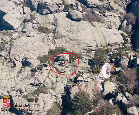 Comunicado el incidente al centro coordinador de emergencias, se da salida al helicóptero del Grupo de Rescate y Salvamento de la Junta de Castilla y León, que sale hacia la zona con su equipo de rescate a bordo. Tras localizar al montañero en el pareje en el que se encuentra, descienden a tierra los dos rescatadores en sendas maniobras de grua corta. Tras valorar el estado en el que se halla, se le iza en primer lugar junto con el enfermero rescatador mediante triángulo de evacuación, y a continuación, de la misma manera, al segundo rescatador.