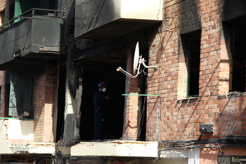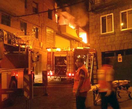 Videograbación efectuada por vecinos en los primeros compases del incendio, tras la explosión. A la espera de los bomberos, puede apreciarse a una decena de vecinos que han huido de la casa en tanto las llamas se expanden por la fachada del número 5. En un momento dado se aprecia como cede la balconada de la vivienda donde parecen haberse originado las llamas.