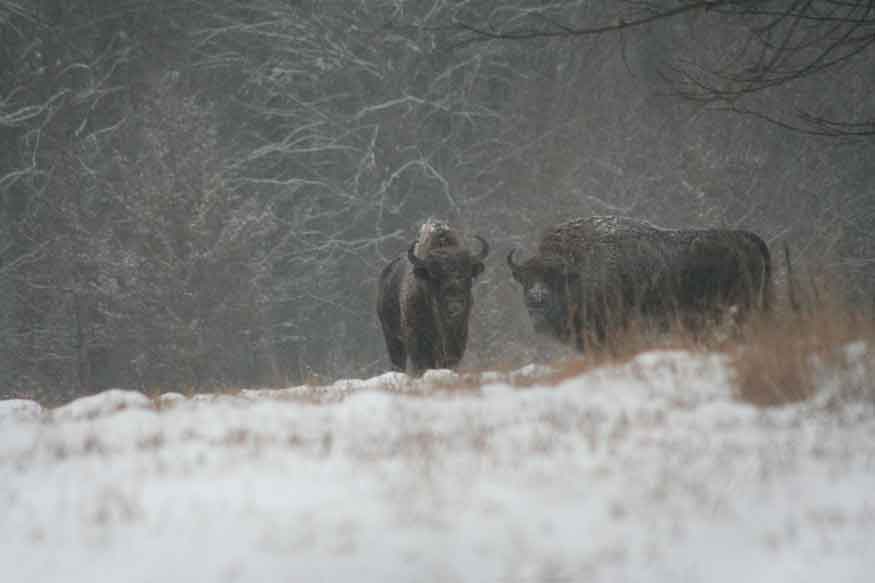 Los bisontes europeos, a diferencia de sus parientes americanos, son habitantes del bosque y desaparecieron gradualmente del continente conforme los bosques de hoja caduca desaparecían sustituidos por campos. Tras la I Guerra Mundial se extinguieron de su último baluarte en  Bialowieza, en la frontera de Polonia con Bielorrusia (aquí, una crónica del biólogo segoviano Javier Lázaro, que hace cuatro años realizó diversos estudios de campo en la zona). Felizmente, en los años 50 rusos y polacos iniciaron la recuperación de la especie en Bialowieza a partir de 12 bisontes supervivientes en diversos zoos.