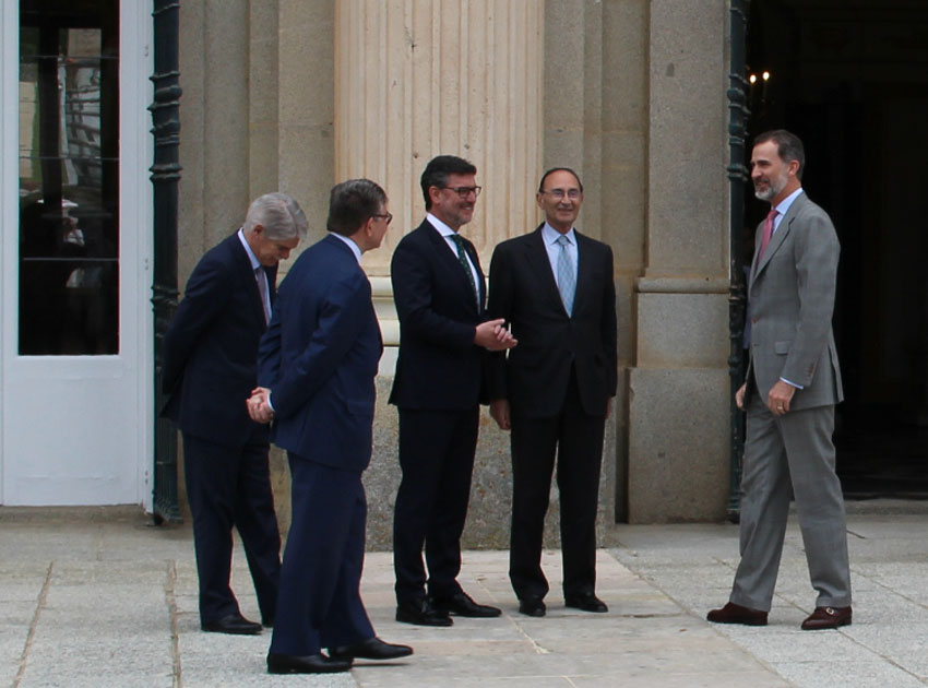 La de 2018 es la tercera visita real con el protocolo ya bien depurado. Primero izado de la bandera con las armas del rey, luego empieza a correr la fuente de La Fama, con su chorro de 30 metros. Este año, y como no será por agua, Patrimonio Nacional, el “casero”, ha corrido también las de Apolo, Andrómeda y las Tres Gracias. Llega el rey en coche, por la entrada de la carretera de Valsaín, y en la puerta es recibido por el alcalde, José Luis Vázquez, el ministro de Exteriores, Alfonso María Dastis, y el presidente del patronato director del instituo, Emilio Lamo de Espinosa. Un “buenos días” de saludo a la treintena de periodistas, un primer posado, y el rey pasa adentro para el besamanos con los expertos. Todo es bastante rápido porque la agenda es apretada, a las 13:15 el rey se va. Así que sin dilación se pasa a la foto de familia y un rápido paseo por la fachada de los jardines hasta la sala de reuniones, donde se realiza la reunión. Al terminar, pincho, aunque el Rey, con la agenda apretada, suele salir escopetado.
