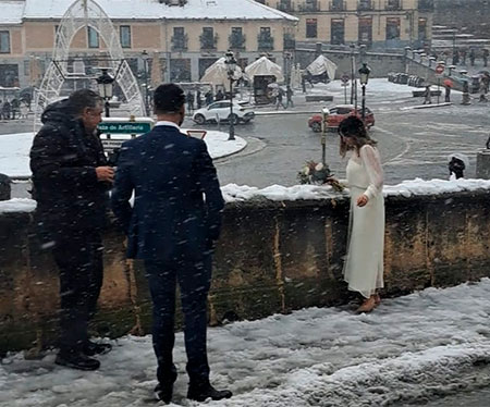 ¿Escogieron el día a propósito para darle un toque frozen al álbum nupcial? ¿Coincidencia? La cuestión es que la blanca novia, oportunamente captada por un viajero del autobús municipal, tendrá una bonita foto a juego con el Acueducto nevado, esa otra postal que en días como hoy convierte las calles de la vieja Segovia en un rally de fotógrafos a la caza de blancos.
