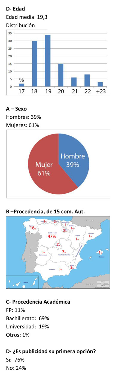 Vallisoletana de 19 años recién cumplidos, con un nivel medio de inglés. Reside en un piso compartido con otros estudiantes y su presupuesto semanal para bocadillos y copas va de los 25 a los 50€ a la semana. Cada viernes vuelve a casa. Procede del bachillerato y Segovia fue su primera opción por dos razones, la ciudad está cerca y en la facultad no pedían nota para cursar lo que quiere ser de mayor: trabajar en el sector de la publicidad. No fuma, practica deporte uno o dos días a la semana y a diario dice estudiar entre dos y tres horas, preferiblemente en su piso compartido.