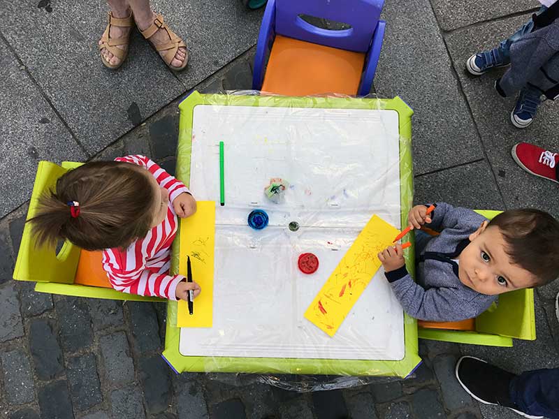 Dos niños participan en una actividad de la Luna Llena en la plaza mayor.