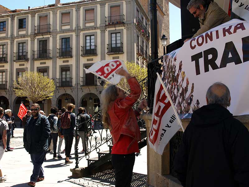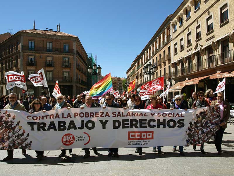 A la protesta se sumaron varios alcaldes, concejales y parlamentarios regionales y nacionales del PSOE, así como representantes de IU en Segovia. La marcha estaba encabezada por una pancarta con el lema “Contra la pobreza salarial y social, trabajo y derechos”, mientras que buena parte de los manifestantes agitaba banderas de los sindicatos convocantes salpicadas por una bandera republicana, la multicolor del colectivo de gays y lesbianas y otras de CjC que lucían la hoz y el martillo.
