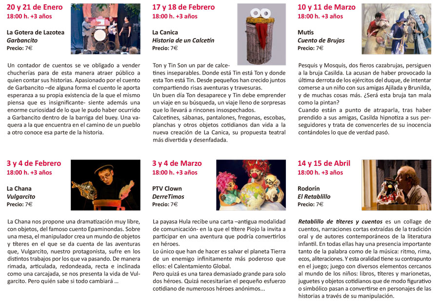 Los días 20 y 21 de enero, 3 y 4, 17 y 18 de febrero; 3 y 4, 10 y 11 de marzo; y 14 y 15 de abril, Titirimundi, junto con el Ayuntamiento de Segovia y la colaboración de Caja Rural, ofrecerá, a través del ciclo Vamos al Teatro, seis espectáculos de títeres dirigidas a los niños en la Sala Julio Michel de La Cárcel_Segovia Centro de Creación. Las entradas, al precio de 7€, están ya a la venta desde hoy en www.turismosegovia.com y en el Centro de Visitantes de 10:00 a 17:00 de lunes a sábado y de 10:00 a 16:00 los domingos. También en las taquillas de La Cárcel, una hora antes de cada representación.