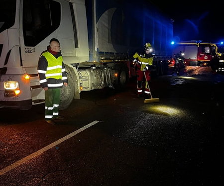 El aviso fue recibido a través del Servicio de Emergencias 1-1-2, que alertó del siniestro pasadas las siete y media de la tarde. Hasta el lugar se desplazaron cuatro efectivos, un jefe de dotación y tres bomberos, con una Bomba Rural Pesada. A su llegada comprobaron que los ocupantes de ambos vehículos se encontraban en buen estado, si bien el depósito del camión presentaba una brecha por la que se estaba produciendo un derrame importante de combustible.