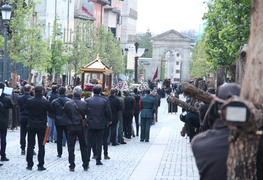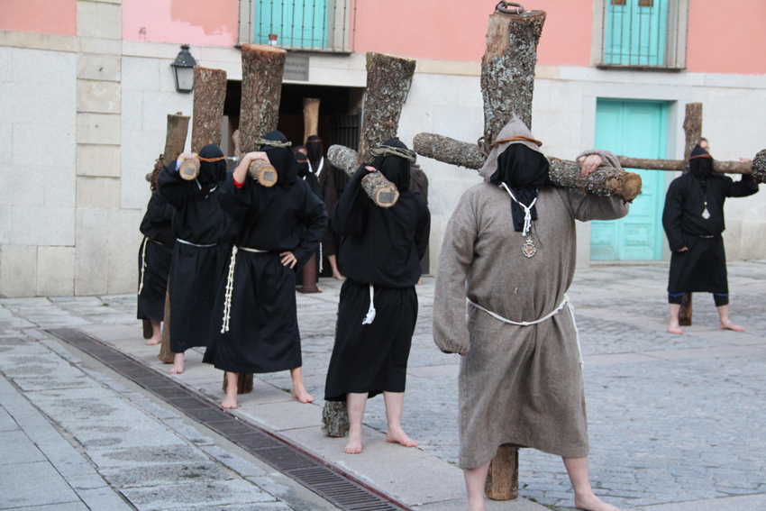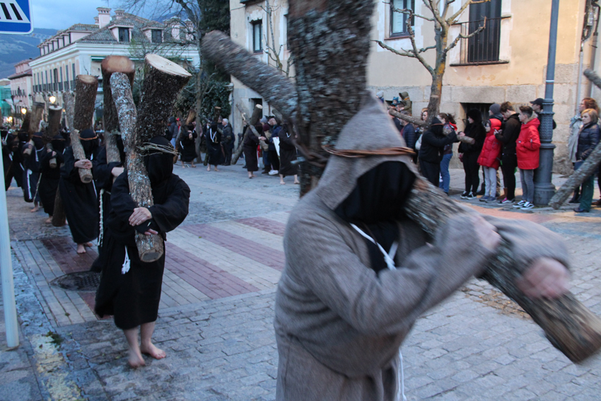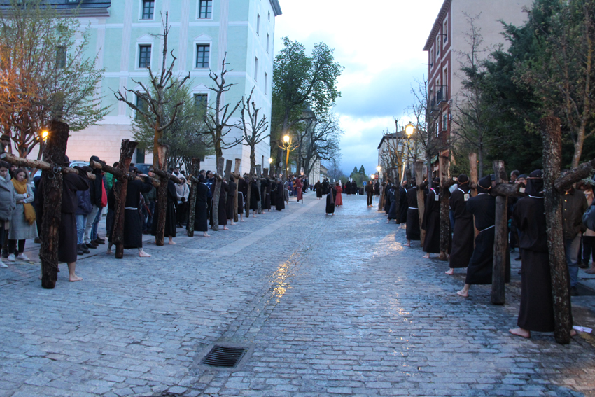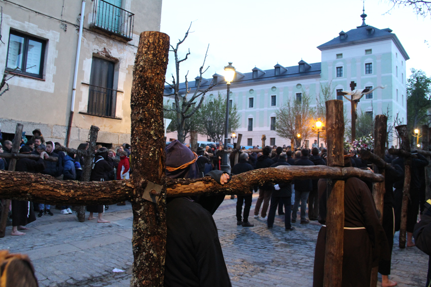 Es la de La Granja una procesión con personalidad. Solemne, sentida y sin florituras, una de las más emotivas de Castilla. Las cofradías tienen su origen en 1755 -apunta el vicepresidente de la junta de cofradías, Isidoro Arévalo, aunque la procesión del Silencio empezó en 1804. Actualmente procesionan sobre 200 vecinos, 130 cargando rústicas cruces de roble que andarán entre los 30 a los 60 kilos, puede que más. Impresionante. Salen tres cofradías, la Real Hermandad del Cristo del Perdón y la soledad de la Virgen, con la Dolorosa, la del Cristo de los Alijares, y la Venerable Orden Tercera de San Francisco, con el Cristo Yacente del siglo XVIII y obra de Carmona.