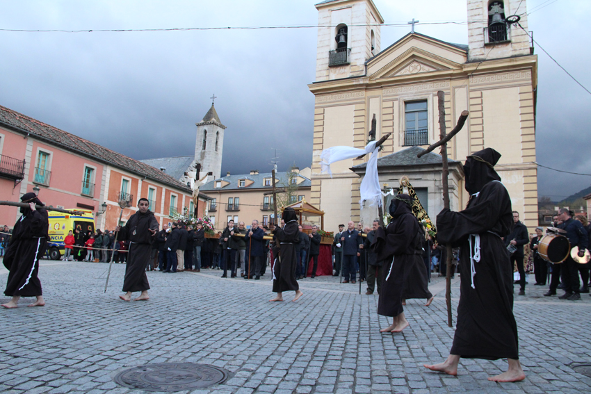 Un viento polar. Dicen los granjeños castizos que cuando hay viento la lluvia se va para Segovia. La teoría es que que como las nubes se forman en la Sierra el viento se las lleva. No funcionó y en el Real Sitio los 130 penitentes, descalzos y cargando enormes cruces, se mojaron bien mojados.