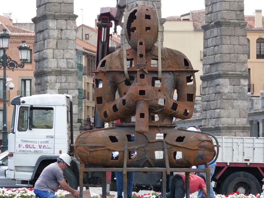 Más cosas que han hecho ruido estos días. ¡Ah, si! La instalación de la figura gigante ,obra de Xavier Mascaró en plena Plaza Oriental (o de la Artillería, que siempre me lío, donde su guardián-músico de tres metros de altura ha generado un torrente de opiniones en las redes sociales, muchas de ellas en contra de la pieza de hierro. Pues le digo dos cosas: me gusta ese tipo de arte con el acueducto de fondo y me chirría más, por ejemplo, el conjunto escultórico religioso a base de luces y alambres que colocan allí en Navidad. Cuestión de gustos ¿No?
