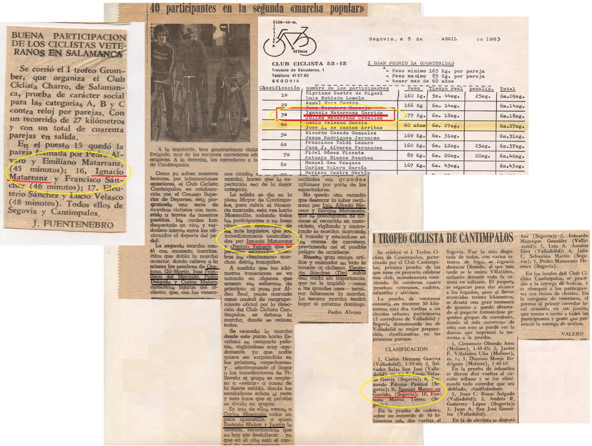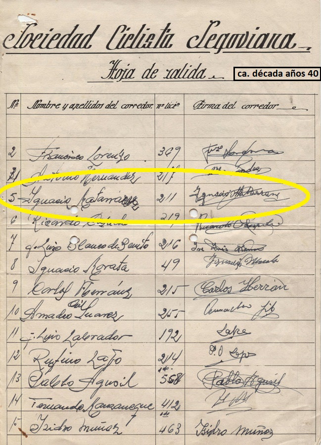 Competiciones, como la organizada en los años 50, por la Sociedad Ciclista Segoviana, en la que entre las firmas de participantes, reconocemos la de Matarranz (3), junto a la de Fernando Manzaneque (14), otro de los grandes del ciclismo nacional (con 11 Vueltas a España y 8 Tour de Francia a sus espaldas).