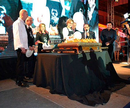 Tejerina partiendo el cochinillo. La cancha del Perico devenida sala de banquetes para 800 comensales.